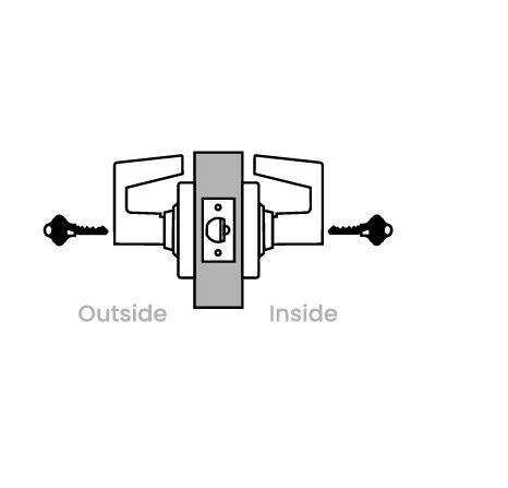 Latch retracted by key from outside when the outside lever is unlocked by key in inside lever. Inside lever is always unlocked. Vandlgard is designed to disengage outside spindle from latch when locked.