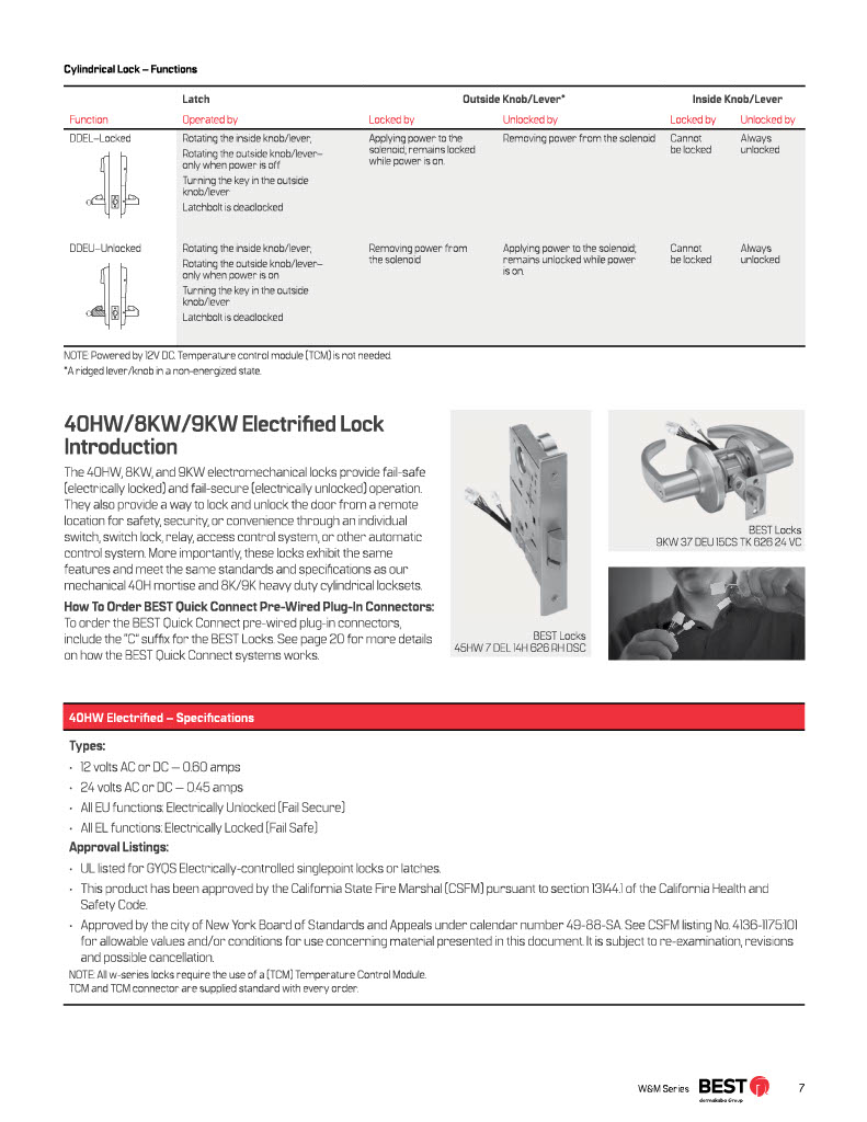 Latch operated by:Outside knob/lever when power is removed from the solenoid Outside key Inside knob/lever Latchbolt is deadlocked by an auxiliary latch