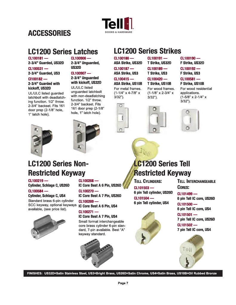 Cylinder:Schlage (SCC), Schlage C 6-pin standard. also available with (SC5) 5-pin, Schlage E (SCE), Arrow A (ARA), Corbin 60 (C06), Corbin 59A1 (C059A1), Corbin Russwin L4 (CL4), Russwin D1 (RD1), Sargent LA (SAL), Schlage F (SCF), Weiser E (WRE), Yale 8 (YA8), Yale GA (YGA)