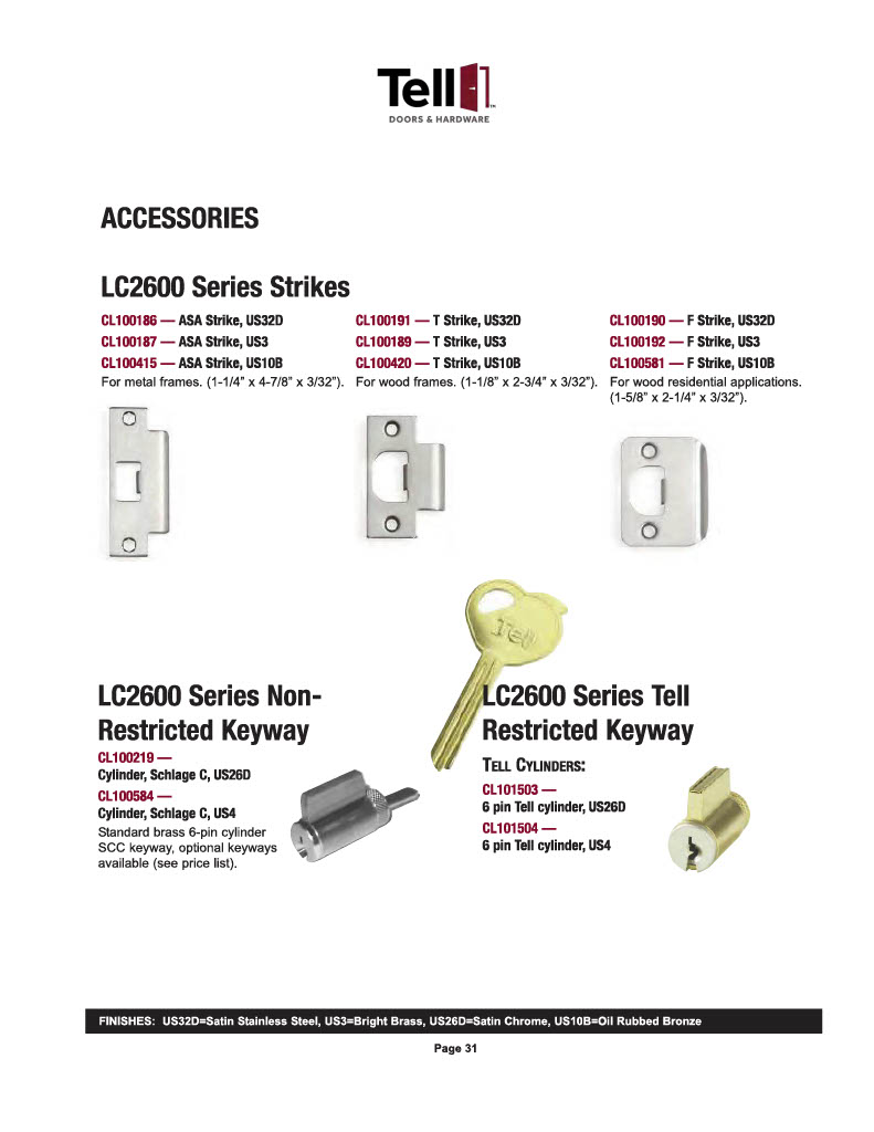 Cylinder:Schlage (SCC), Schlage C 6-pin keyway standard. (SC5) 5-pin, Schlage E (SCE), Arrow A (ARA), Corbin 60 (C06), Corbin 59A1 (C059A1), Corbin Russwin L4 (CL4), Russwin D1 (RD1), Sargent LA (SAL), Schlage F (SCF), Weiser E (WRE), Yale 8 (YA8), Yale GA (YGA) available
